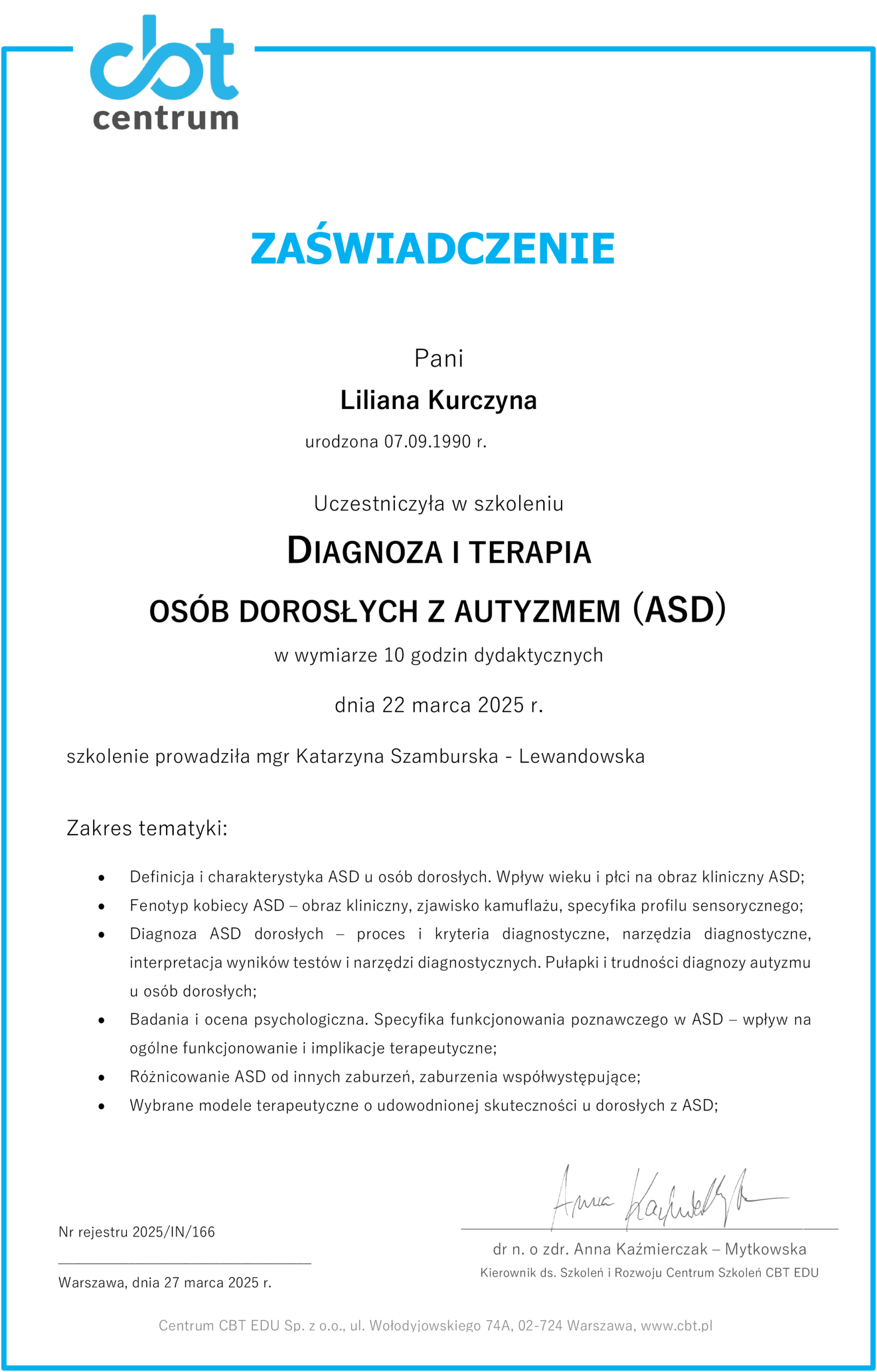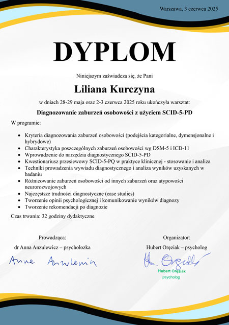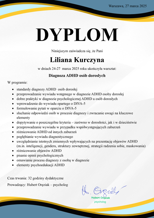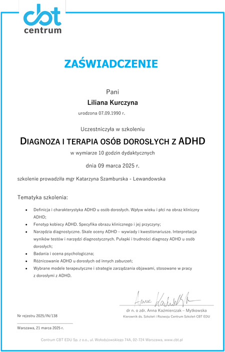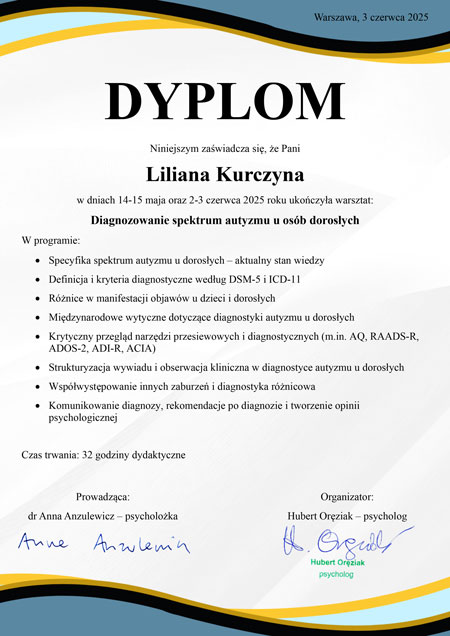 • Diagnoza ADHD i / lub spektrum autyzmu – przeprowadzam tylko rzetelną diagnozę jednostek neurorozwojowych u dorosłych wykorzystując DIVA – 5 (ADHD) i ACIA (spektrum autyzmu – ASD). Uzyskanie diagnozy pomaga zrozumieć swoje trudności i otwiera drogę do możliwie najskuteczniejszego wsparcia.